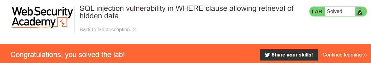 Lab: SQL injection vulnerability in WHERE clause allowing retrieval of hidden data | Web Security Academy