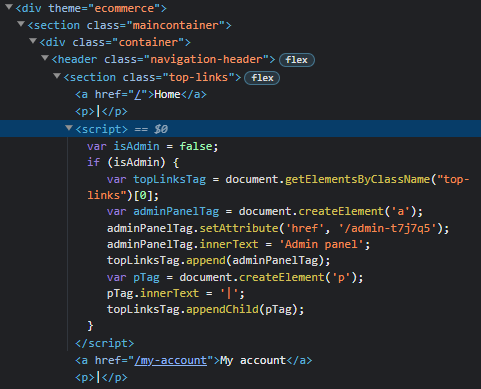 확인하면 Home 과 My account 버튼 사이에 스크립트 코드가 있는 것을 확인할 수 있다.