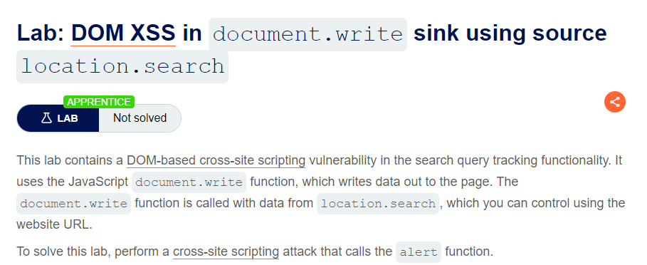 This lab contains a DOM-based cross-site scripting vulnerability in the search query tracking functionality. It uses the JavaScript document.write function, ...