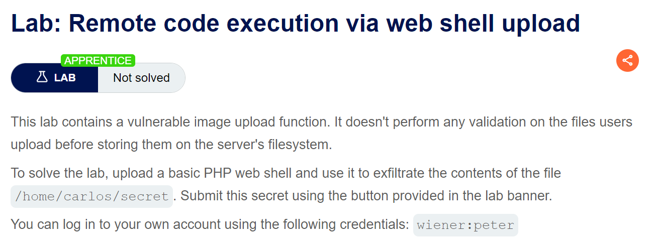 This lab contains a vulnerable image upload function. It doesn't perform any validation on the files users upload before storing them on the server's ...