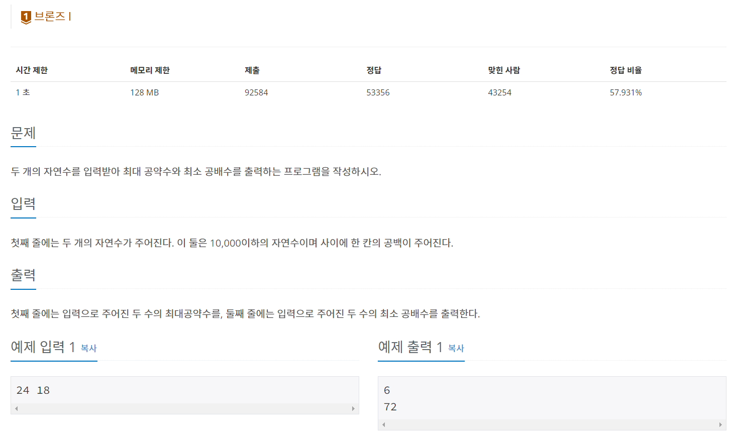 두 개의 정수를 입력받고 그 수의 최대공약수와 최소공배수를 출력하는 문제이다.