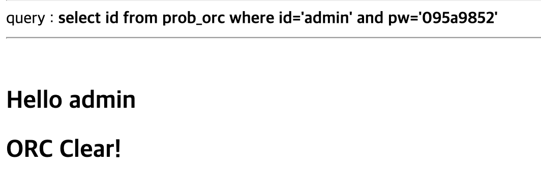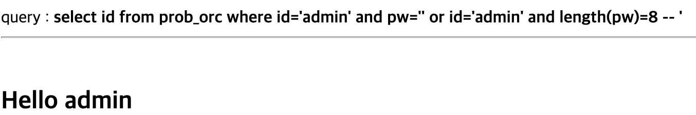 pw를 입력받아서 쿼리 결과가 있다면 Hello admin을 띄운다.