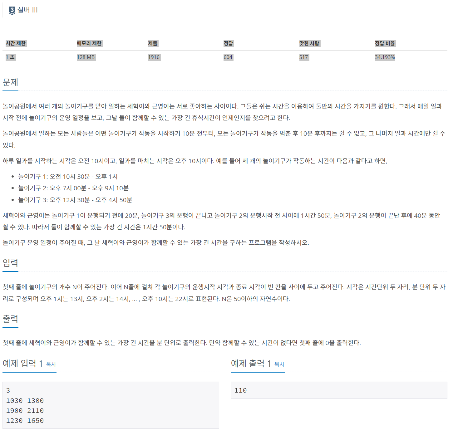 놀이기구를 운영하지 않는 시간(쉴 수 있는 시간) 중 제일 긴 시간을 출력하는 문제이다.