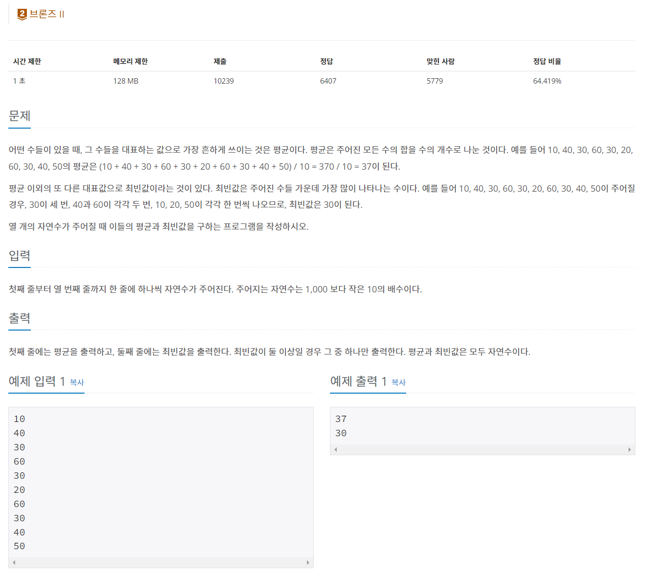10개의 수를 입력받고 입력 받은 값의 평균과 최빈값을 출력하는 문제이다.