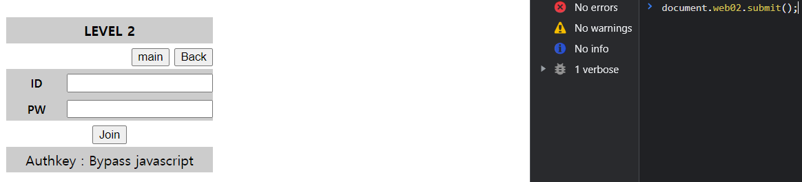 id와 pw에 같은 값을 넣고 console창에서 document.web02.submit() 한다.