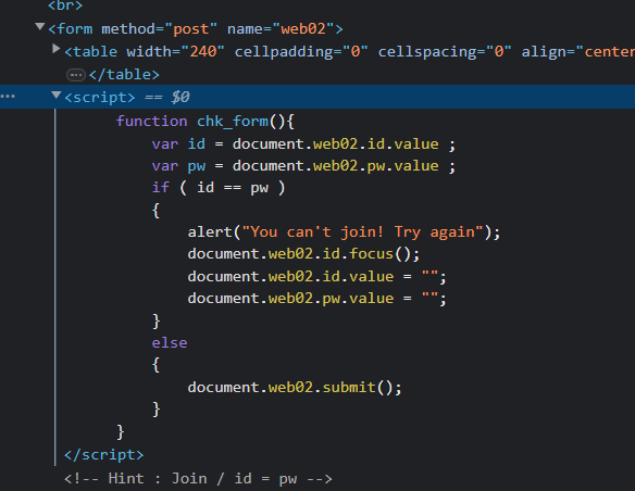 id와 pw에 같은 값을 넣고 console창에서 document.web02.submit() 한다.
