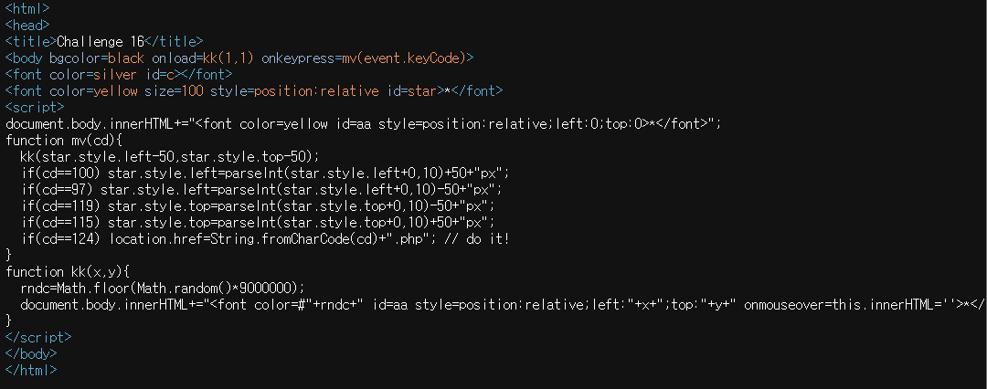 그중에서 if(cd==124)를 보면 다른 코드와 다르게 php페이지로 이동하는 코드이다. 그리고 주석으로 do it이라 적혀있는 것을 보고 124번 아스키코드를 가지고있는 키를 누르면 문제가 풀린다고 생각할 수 있다.