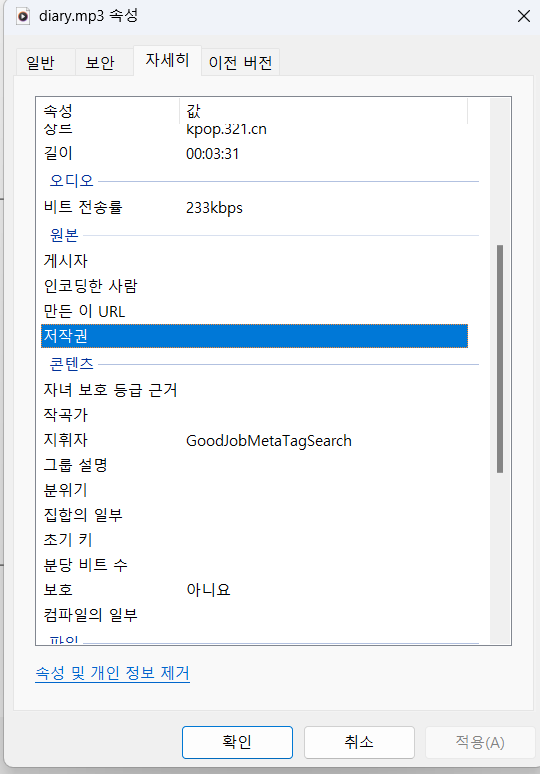 속성에 들어가 자세히 탭으로 이동하면 지휘자가 있다.
