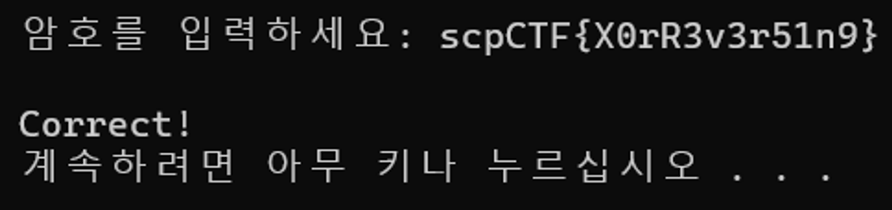 Flag값이 나오게 되고 프로그램에 입력했을 때도 Flag값이 일치하여 Correct!가 뜨는 걸 확인할 수 있다.