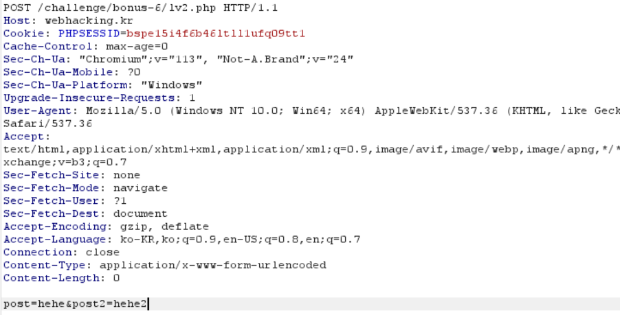 POST방식으로 post는 hehe, post2는 hehe2로 입력받으면 다음문제로 넘어간다.