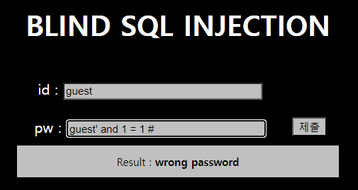 이지만 입력받은 패스워드는 guest' and 1 = 1# 이고 패스워드는 guest이기 때문에