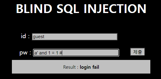 login fail이 뜬다. 이는 sql에서 id = guest and pw = a and 1 = 1