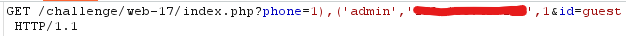 insert into chall35(id,ip,phone) values('{$_GET['id']}','{$_SERVER['REMOTE_ADDR']}',{$_GET['phone']})